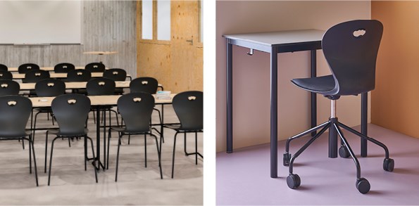 Plastskal av 100 % återvunnet material. Stolen uppfyller EN 1729-1 Sixemark 5&6, vilket innebär att användare mellan 146 och 188 cm sitter bekvämt och ergonomiskt riktigt. Väskkrok på baksidan. Moviflexmekanismen gör att man kan vippa på sitsen åt alla håll, vilket uppmuntrar ett aktivt sittande. Svart plastkryss med glidfötter. Mått: Sitthöjd 38-50 cm. Sitsbredd 42. Sitsdjup 40 cm. Välj till klädd sits i 100 % återvunnet material.