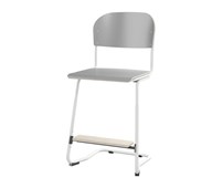 Stapelbar. Ljuddämpande tassar. Upphängningsbar på bord. Reglerbar fotbräda i 3 fasta lägen. Sits i högtryckslaminat. Silverlackerat stativ, RAL 9006. Testad och godkänd enligt standard EN 1729-2.