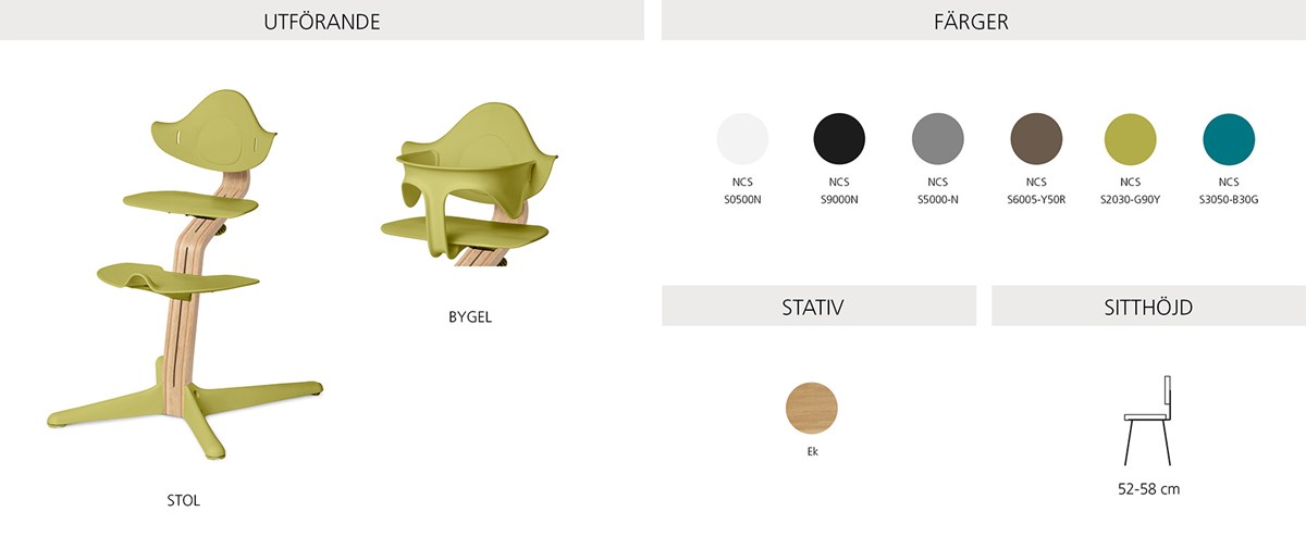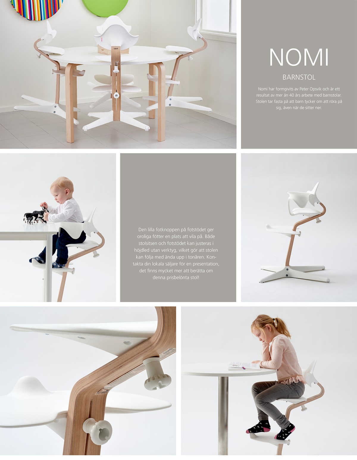 En barnstol från Tripp Trapp-stolens skapare, Peter Opsvik. Både stolsitsen och fotstödet kan justeras i höjdled, utan verktyg, vilket gör att stolen kan följa med ända upp i tonåren. Fotknoppen på fotstödet stimulerar och ger oroliga fötter en plats att vila på. Sitsens och fotstödets form förhindrar att barnet glider framåt, och hjulen baktill ger maximal säkerhet mot att tippa bakåt. Stolen hängs lätt på bordskanten. Skiktlimmad pelare med kärna av bok belagd med ekfaner. Sits, rygg, fotstöd och ben i polypropen. Producerad i hållbara och återvinningsbara material. Sitthöjd 52-58 cm. Ryggens storlek B36,5xH22 cm. Stolens mått i basen B52xD59 cm. OBS! Bygel köps separat.