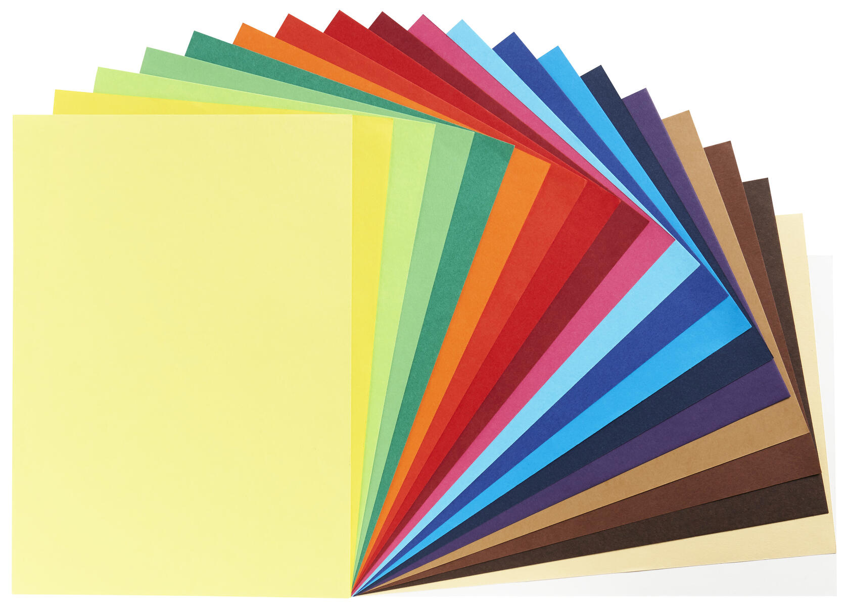 200 ark/fp. Färgad kartong i mellanvikt 220 g. Slät halvglättad yta. Passar till lite större och grövre detaljer eller som botten/monteringskartong för t.ex. kort. Kan både klippas och skäras. 20 färger, 10 ark/färg. Innehåller citrongul, gul, orange, röd, mörkröd, cerise, violett, ljusblå, cyanblå, ultramarinblå, limegrön, ljusgrön, grön, mörkgrön, brun, mörkbrun, ljusrosa, äggskal, grå och svart. Svanen, licensnummer 30440101. PVC-fri.