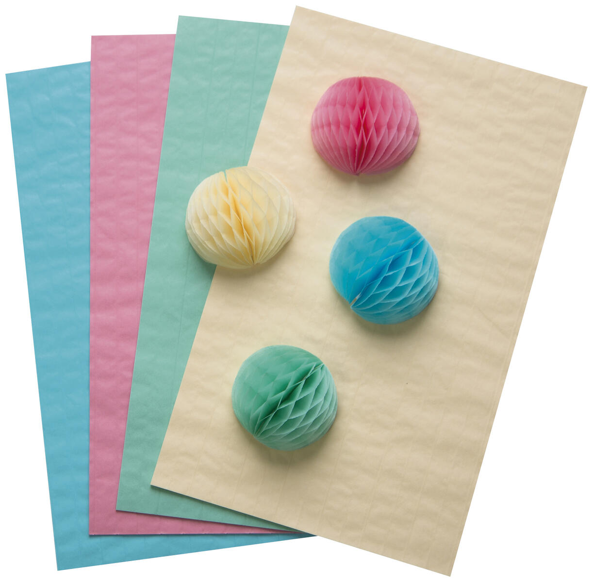 4 ark/fp. 1 ark/färg. Tunna lager silkespapper sammanfogade till ark som kan klippas i olika former och vikas ut till figurer. Färgerna aprikos, ljusrosa, mintgrön, ljusblå ingår. Arkens storlek 20x33 cm. PVC-fri.