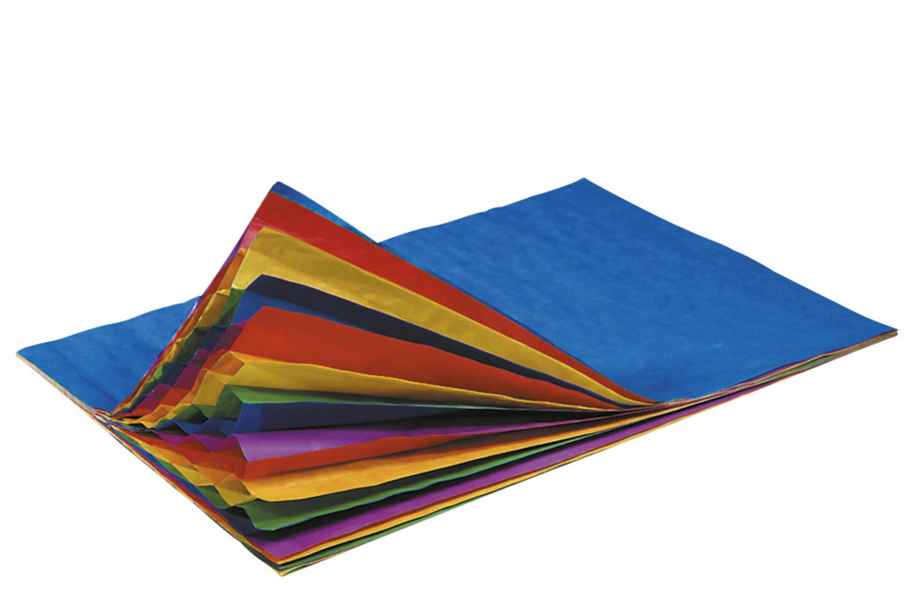 250 ark/fp. Silkespapper i 10 olika färger. 25 ark/färg. 50x70 cm. Innehåller färgerna solgul, orange, röd, ultramarinblå, turkos, grön, brun, rosa, svart och vit. Syrafritt. 18 g. PVC-fri.