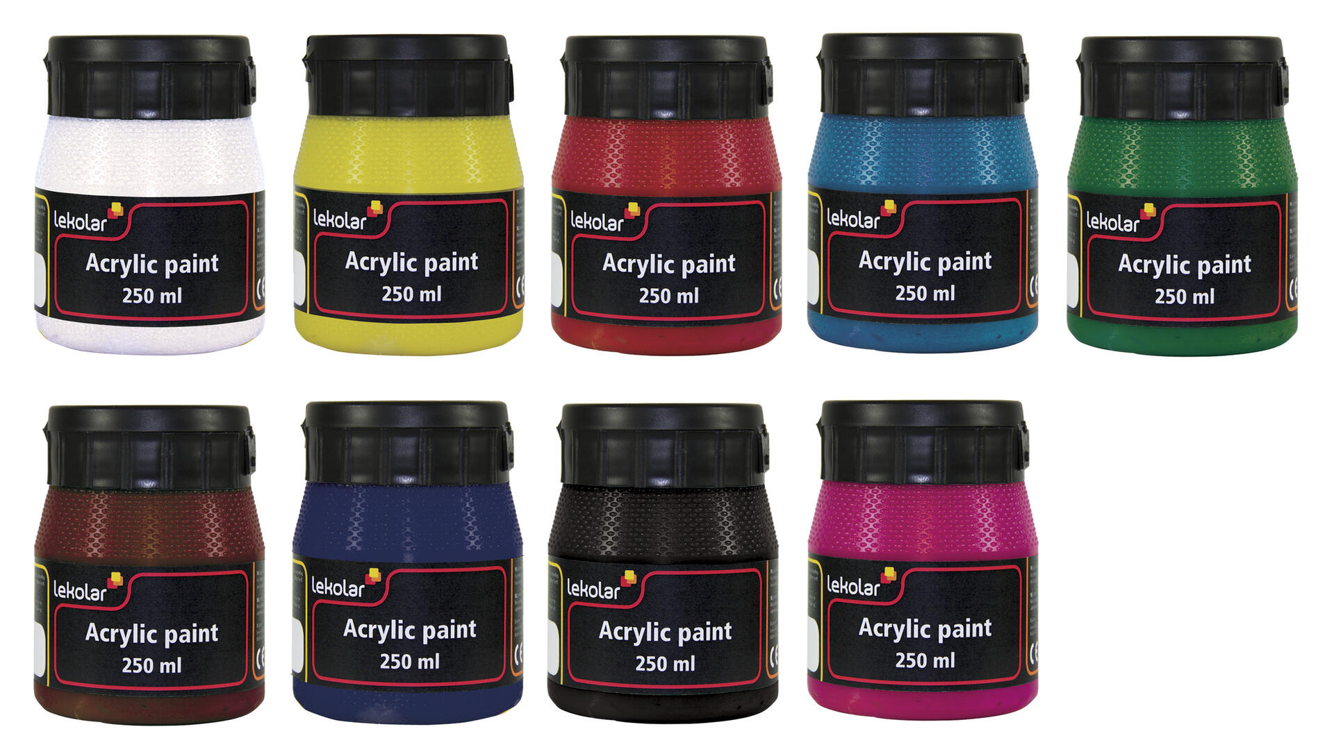 9x250 ml. Vattenbaserad och ljushärdig akrylfärg med hög pigmenthalt. Kan användas på de flesta underlag som pannå, målarduk, papper, trä och lera. Penslar och verktyg rengörs i vatten omedelbart innan färgen torkar. Ger en halvblank och vattenfast yta. Torktid ca 15 min. Färgen kan smeta av sig innan den är helt torr, skydda alltid kläder och ömtåliga ytor. Klassuppsättning av vår akrylfärg innehåller 1 flaska av varje citrongul, mörkröd, magenta, blå, preussisk blå, smaragdgrön, bränd umbra, svart och vit.