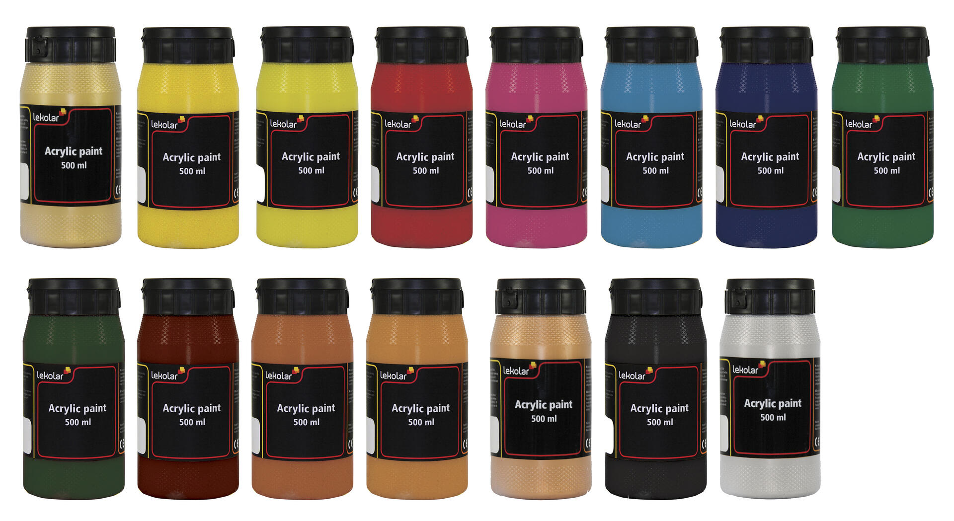 6x500 ml/fp. Vattenbaserad akrylfärg i mycket hög kvalitet som kan användas på de flesta underlag, t.ex. papper, målarduk, pannåer, trä och lera. Torkar till en slät sidenmatt yta. Penslar och verktyg rengöres omedelbart i vatten före torkning. Vattenfast efter torkning. Ingår: 1 x Process yellow (gul), 1 x svart mars (svart), 1 x Process magenta (röd), 1 x Process cyan (blå) och 2 x titanium white (vit).