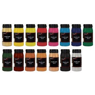 10x500 ml/fp. Vattenbaserad och ljushärdig akrylfärg med hög pigmenthalt. Innehåller färgerna Carmine red, magenta, white, primary yellow, black, vermillion, cyan, prussian blue, brilliant green, och dark green. Kan användas på de flesta underlag som pannå, målarduk, papper, trä och lera. Penslar och verktyg rengörs i vatten omedelbart innan färgen torkar. Ger en halvblank och vattenfast yta. Torktid ca 15 min.
