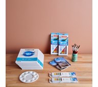 Paket med material för 8-10 användare. Innehåller: Akvarellblock A4 10 st, Studioakvarell i låda 2 st, Akvarellfärg på tub 24x12 ml, Akvarellpenslar 24 st, Blandpalett rund 5 st, Akvarellpennor 2 fp.