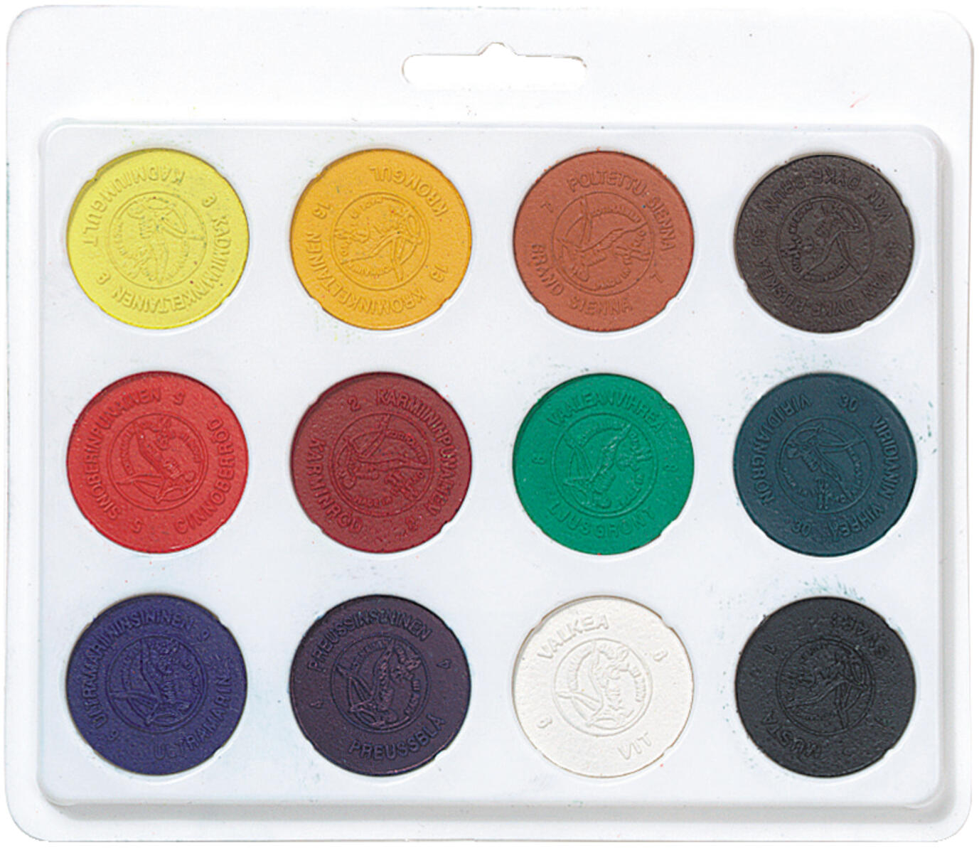 Transparent färg som torkar genomskinligt jämfört med vanliga färgblock. ø 30 mm. Följande nyanser ingår: citrongul, gul, röd, cinnoberröd, blå, mörkblå, ljusgrön, grön, ljusbrun, mörkbrun, svart och vit. Tjocklek 4 mm. Låda av styrenplast. Refill 76195. PVC-fri.