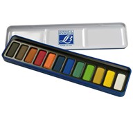 12 färgblock/fp. L&B studioakvarell i metalletui. Mått på färgblocken är 30x13 mm. Färgerna har hög pigmentering och kan appliceras till såväl tunna transparenta lager som mer kulörintensiva. Färgerna har god ljusbeständighet. Ett bra material för den som vill fördjupa sina färdigheter i akvarell. Innehåller gambogegul, vermillion, karminröd, ultramarin, preussisk blå, lövgrön, buteljgrön, gulockra, bränd siena, mörkbrun, svart och täckvit.
