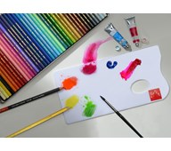 Liten plexipalett av akryl med en slät och en grängad sida. Den släta sidan används som en vanlig palett för fastare färger. Den grängade sidan kan användas som underlag för vax- och akvarellkritor, grafitpennor etc. som blandas och t.ex. gnuggas mot ett underlag. Rengörs med vatten och milt handdiskmedel. Mått: 13x26 cm.
