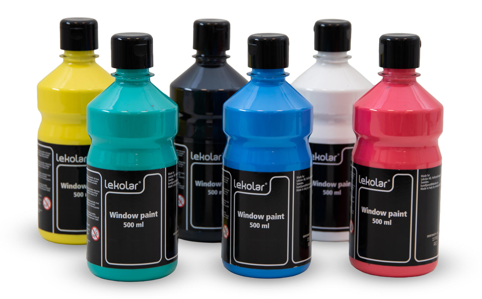 6x500 ml/fp. Vattenbaserad och transparent färg som på glas och klar plast släpper igenom ljuset mycket vackert. Används på plastfilm. Motivet kan efter torkning tas loss från plastfilmen och fästas på plana ytor såsom fönster och glas. Fäster ej permanent, utan kan flyttas om och om igen. Torktiden för färgen är ca 24 timmar och för konturfärgen ca 3 timmar. Använd gärna 41232 refillflaskor med spetskapsyl vid målning för enklare applicering. Ingår: gul, röd, blå, grön och vit färg samt svart konturfärg. Komplettera med vår praktiska pump 162437.