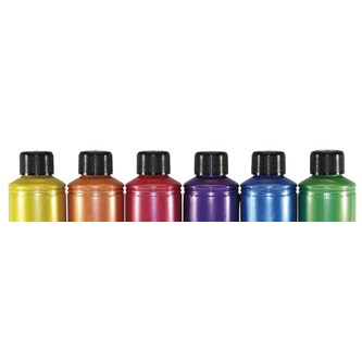 6x500 ml/fp. Vattenbaserad metallicfärg som torkar matt. Extra mycket färgpigment som ger mycket starka och fina färger. Färgen kan användas på de flesta underlag som papper, kartong, styropor, trä, lera m.m. Kan förtunnas med vatten. Torktid ca 60 min. Förpackningen innehåller lila, gul, röd, grön, orange och blå. Komplettera med vår praktiska pump 41007. PVC-fri.