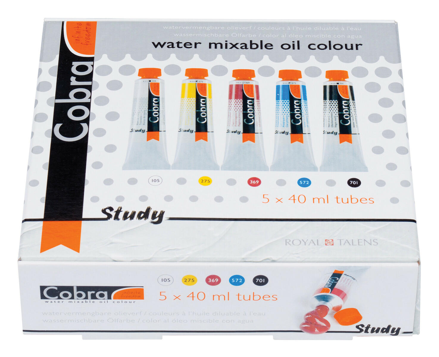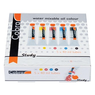 5x40 ml/fp. Cobra är en vattenlöslig oljefärg. Färgen späds med vatten. Tjock och krämig med högt färgpigment. Torkad yta blir vatten- och ljusbeständig. Penslar rengörs lätt med tvål och vatten. Färger som ingår: titanvit, primärgul, magenta, primär cyan och elfenbensvart.