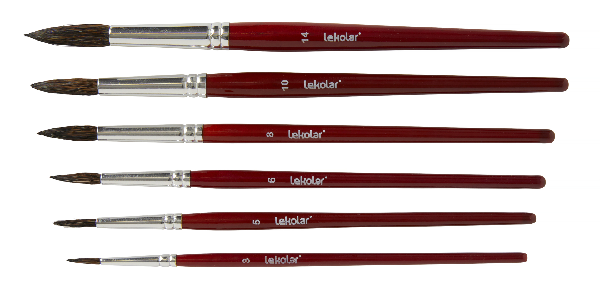 6 st/fp. Innehåller storlekarna 4, 6, 8, 10, 12 och 14. Rund borst av syntetiskt Kolinsky-hår i hög kvalitet. Formfast och vätskehållande: perfekt för akvarellmålning och tunnare färger inklusive sidenmålning. Lackerat skaft av FSC-certifierat trä och aluminiumskoning.