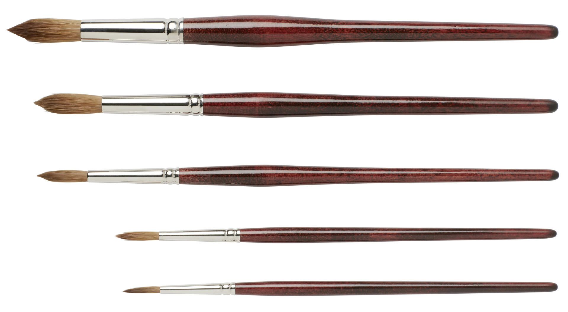 6 st/fp. Innehåller storlekarna 4, 6, 8, 10, 12 och 14. Rund borst av syntetiskt Kolinsky-hår i hög kvalitet. Formfast och vätskehållande: perfekt för akvarellmålning och tunnare färger inklusive sidenmålning. Lackerat skaft av FSC-certifierat trä och aluminiumskoning.