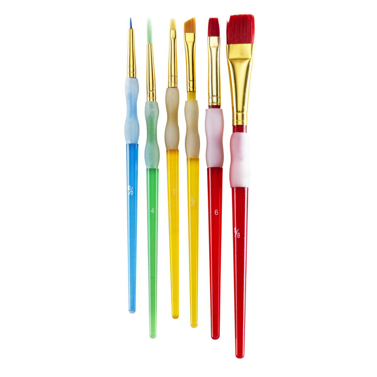 6 st/fp. Innehåller sex olika storlekar: tre runda, två flata och en snedskuren. Försedda med greppvänligt penselgrepp för lättare kontroll och träning av finmotoriken. Stryktålig syntetborst.