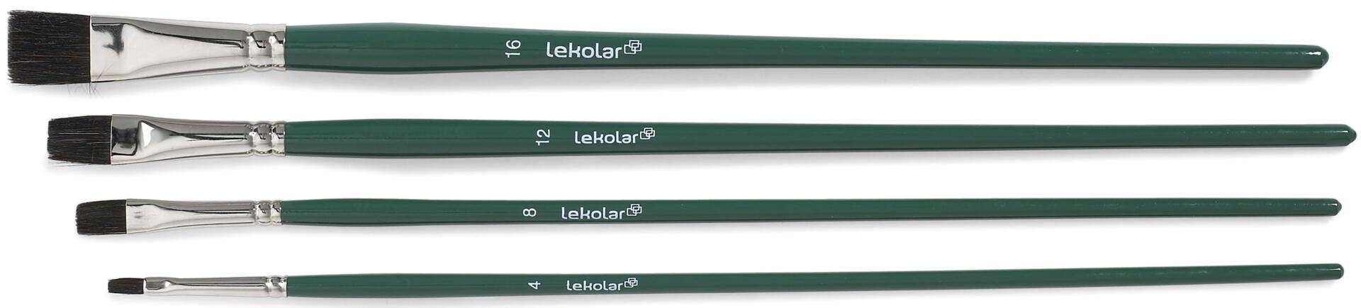 12 st/fp. Tåliga skolpenslar med fin och tät syntetisk borst och flat topp. Passar för både tunnare och trögare flytande studiefärger: akvarell, gouache/tempera, akryl och olja. Toppen är tät och har god formfasthet. Kort, grönlackat träskaft och aluminiumskoning.