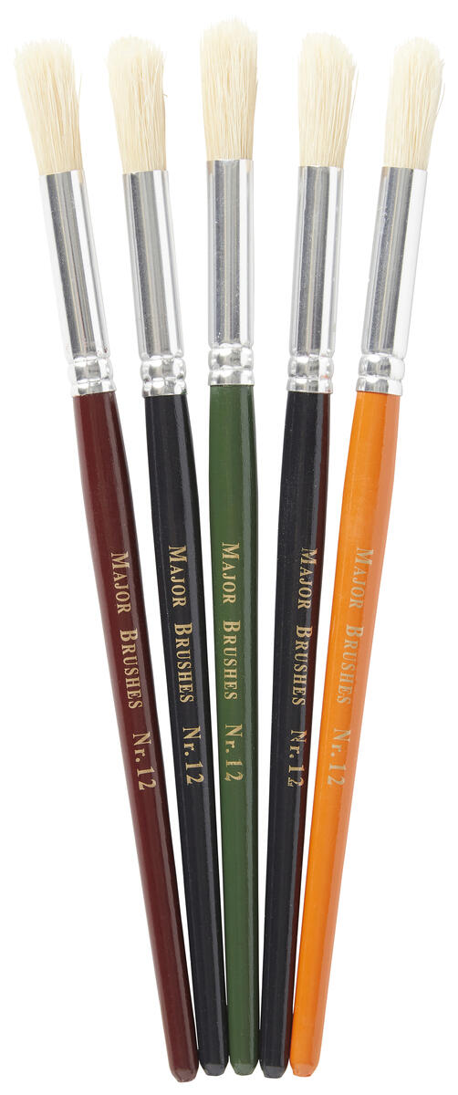 10 st/fp. Hobbypenslar av flat, stadig, vit svinborst med träskaft. Lämpliga för målning med tjockare färg t ex olje-, akryl- batik- och readymix. Skaft ca 12-15 cm.