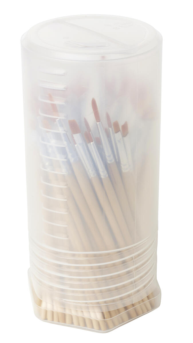 72 st/fp. En mix av runda och flata penslar med brun, syntetisk borst och korta, naturfärgade träskaft. Penslarna passar både tunnare och tjockare färgtyper och är utmärkta nybörjarpenslar. Innehåller 12 st penslar med rund topp vardera av storlekarna 1, 3 och 5, samt 12 st penslar med flat topp av vardera storlekarna 2, 4 och 6. Levereras i praktisk transparent förpackning som kan användas vid förvaring. Burk av PP. PVC-fri.
