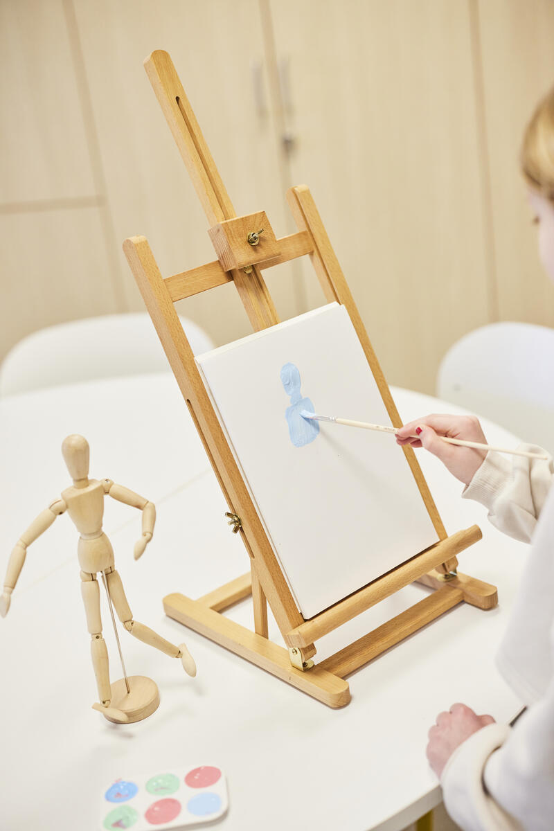 Hopfällbart bordsstaffli som är enkelt att flytta. Perfekt för målningsarbeten men kan också användas för utställningar. Basmått: 20x20 cm. Höjd: 27 cm. Högsta dukhöjd 40 cm. Levereras monterat. Av oljad bok.
