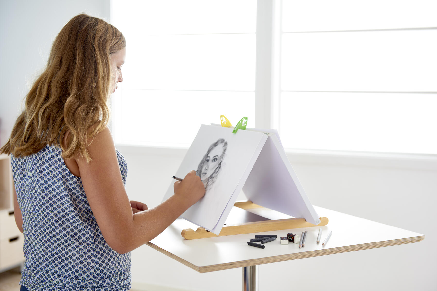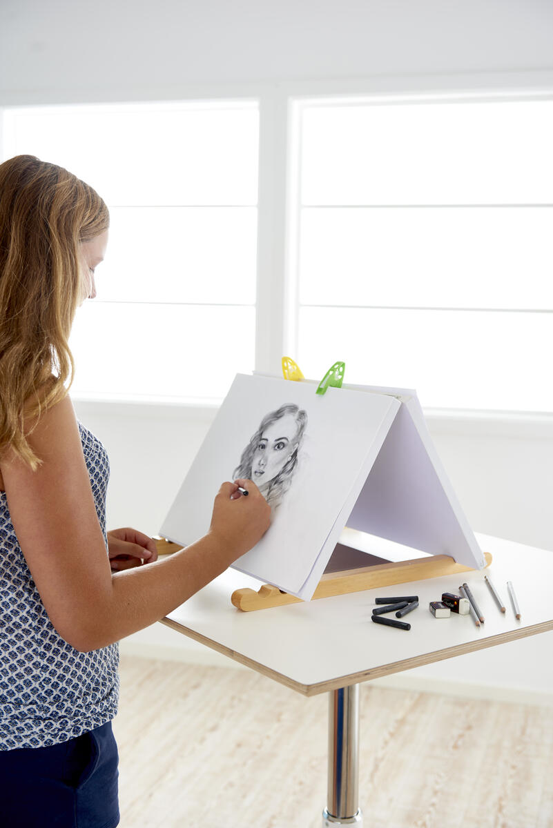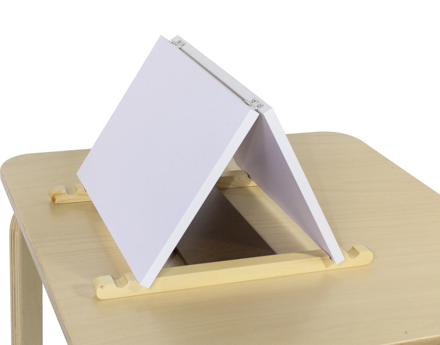 Dubbelsidigt hopfällbart staffli. Skivorna fälls ut och placeras på två skenor. Staffliet är ställbart i två lägen. Mått: 30x42 cm. Klämmor ingår ej. Av MDF med spånskivor.