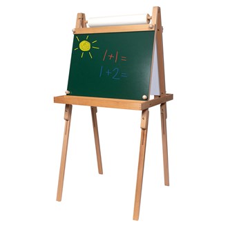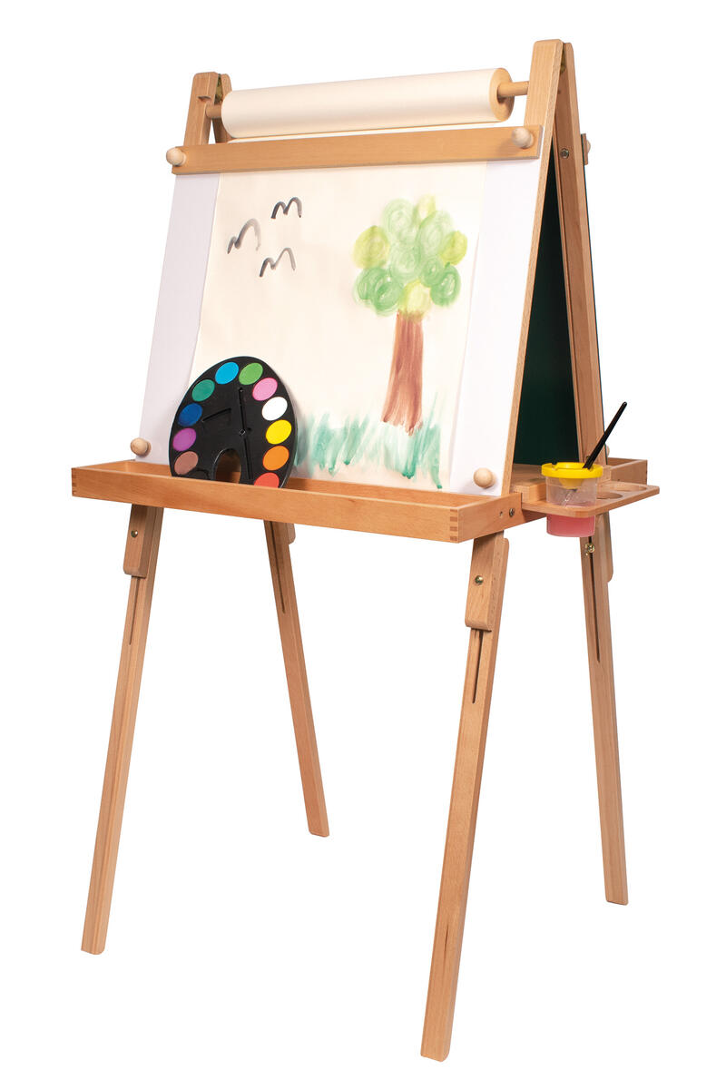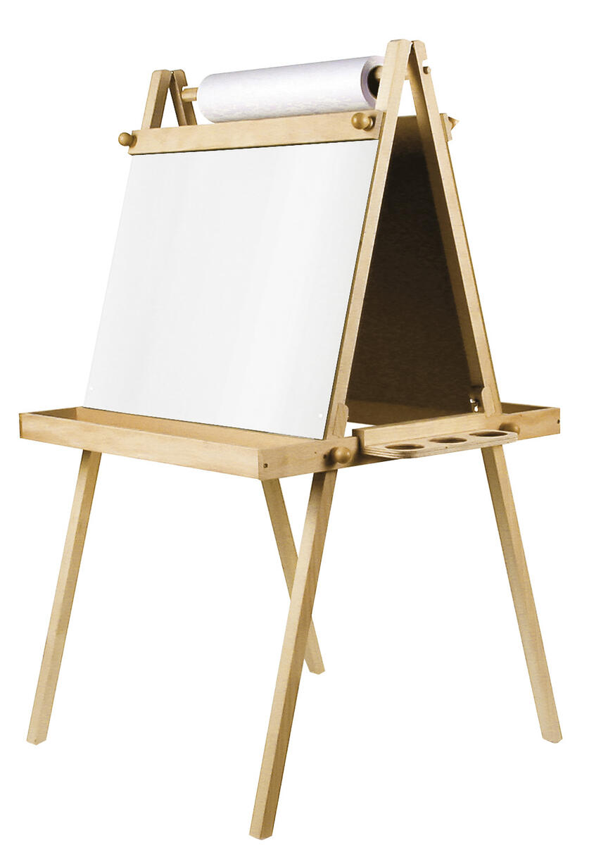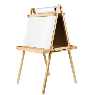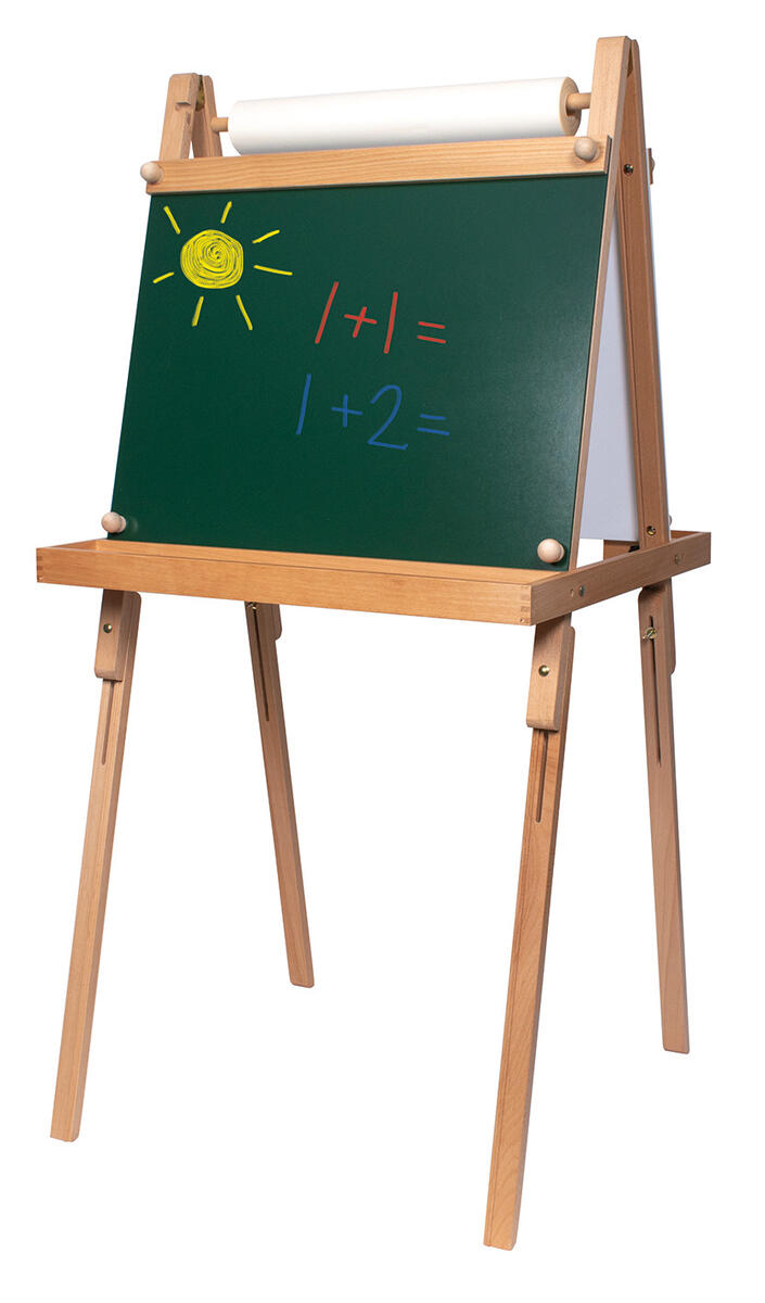 2-sidigt staffli med ena sidan whiteboard och andra sidan griffeltavla. Hållare för ritrulle kan fästas på båda sidor. Whiteboardtavlan och griffeltavlan är 64x61 cm. Förvaringshylla till färgkoppar finns på båda sidorna (12x66,5 cm). Staffliet går att justera i höjd 120-136 cm. Passande ritrulle för staffliet är 77215.