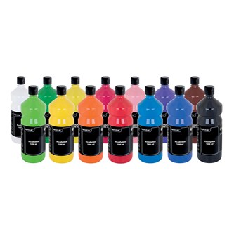 14x1 l/fp. Storpack med vår Readymix. Högpigmenterad, vattenbaserad täckfärg. Torkar snabbt med matt yta och har god täckförmåga. Innan färgen torkat är den vattenlöslig men blir sedan nästan vattenfast. Färgen kan användas på de flesta underlag. Torktid ca 20 min. Färger som ingår är primärgul, ljusgul, orange, röd, primärröd, lila, primärblå, himmelsblå, ljusgrön, grön, brun, rosa, svart och vit. Komplettera med vår praktiska pump 41007. PVC-fri.