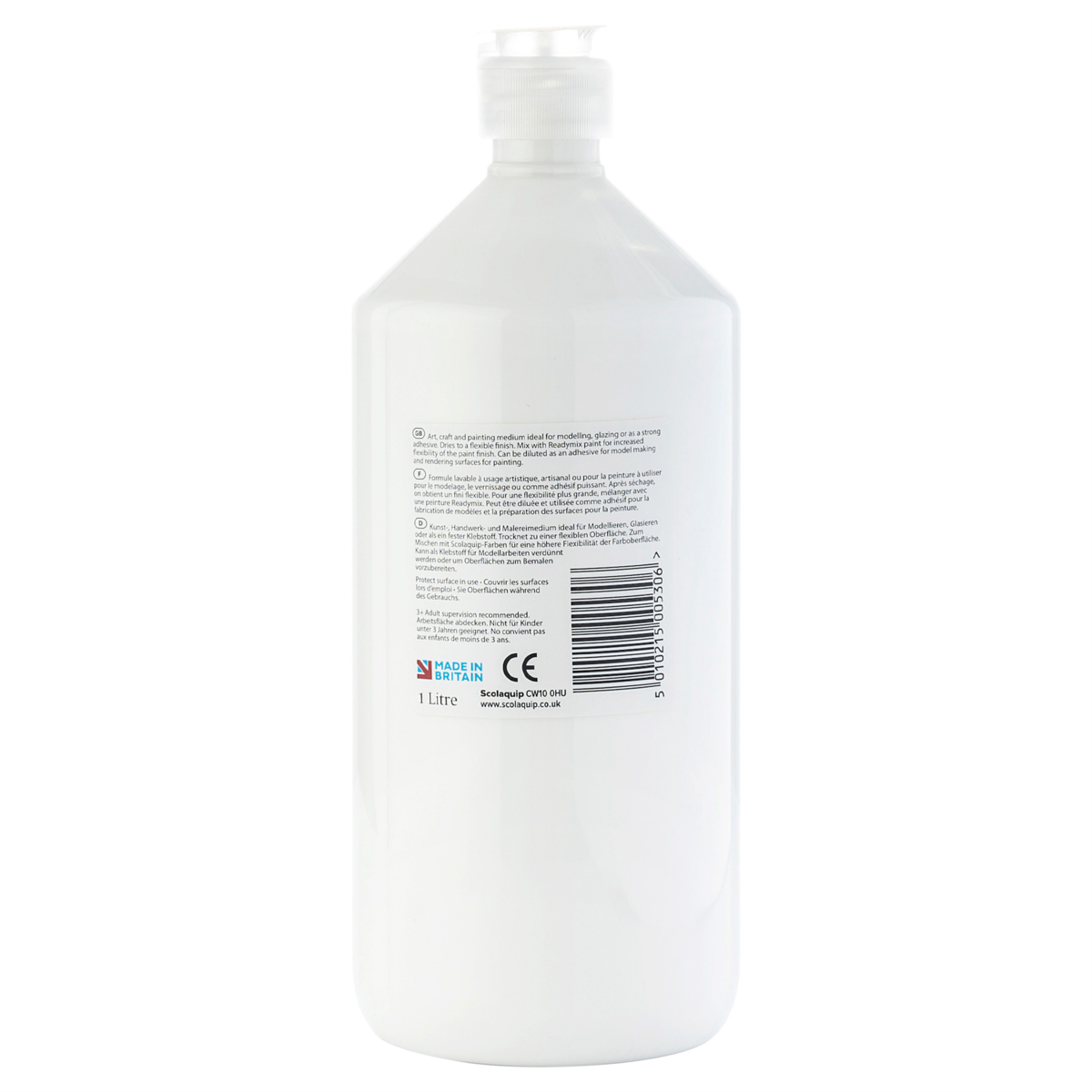 Ett mycket användbart medium, som är vitt innan det torkat men som efter torkning blir blankt och helt genomskinligt. Kan blandas tillsammans med alla färger till nya konsistenser. Idealiskt som lim, som lack på lera och teckningar, som konservering av växter, som collage, som murbruk tillsammans med sand, stenar, sågspån, naturmaterial m.m. Torktid ca 60 min. Penslar och verktyg rengöres i vatten innan de torkat. Dunk av polyetenplast. Vi rekommenderar Pump 46271 som minskar svinn med enklare portionering, och ökar innehållets livslängd eftersom mindre luft och bakterier kommer in i dunken.