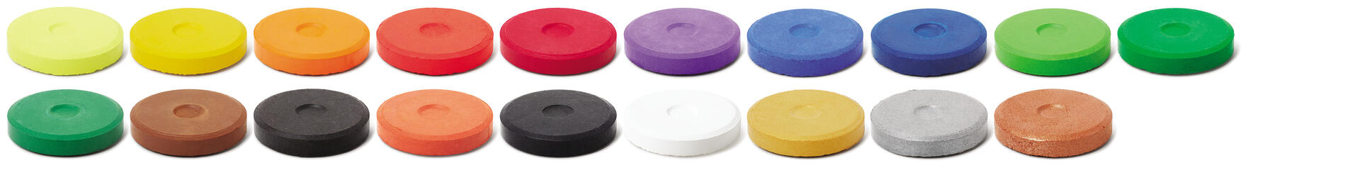 144 st/fp. ø 55-57 mm. Tjocklek 16 mm. Vattenlöslig och blandbar täckfärg med god täckförmåga. Kan användas både vid täckande och laserande målning. Ett klassrumsset som innehåller 12 st av citrongult, klargult, rött, mörkrött, klarblått, mörkblått, klargrönt, mörkgrönt, brunt, svart och vitt samt 6 st av cerise och violett. PVC-fri.