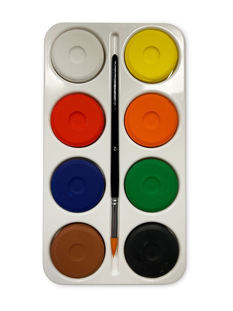 72 st/fp, ø 44 mm. Tjocklek 14 mm. Vattenlöslig och blandbar täckfärg med god täckförmåga. Kan användas både vid täckande och laserande målning. Ett klassrumsset som innehåller 6 st av citrongult, klargult, rött, mörkrött, cerise, klarblått, mörkblått, klargrönt, mörkgrönt, brunt, svart och vitt. PVC-fri.
