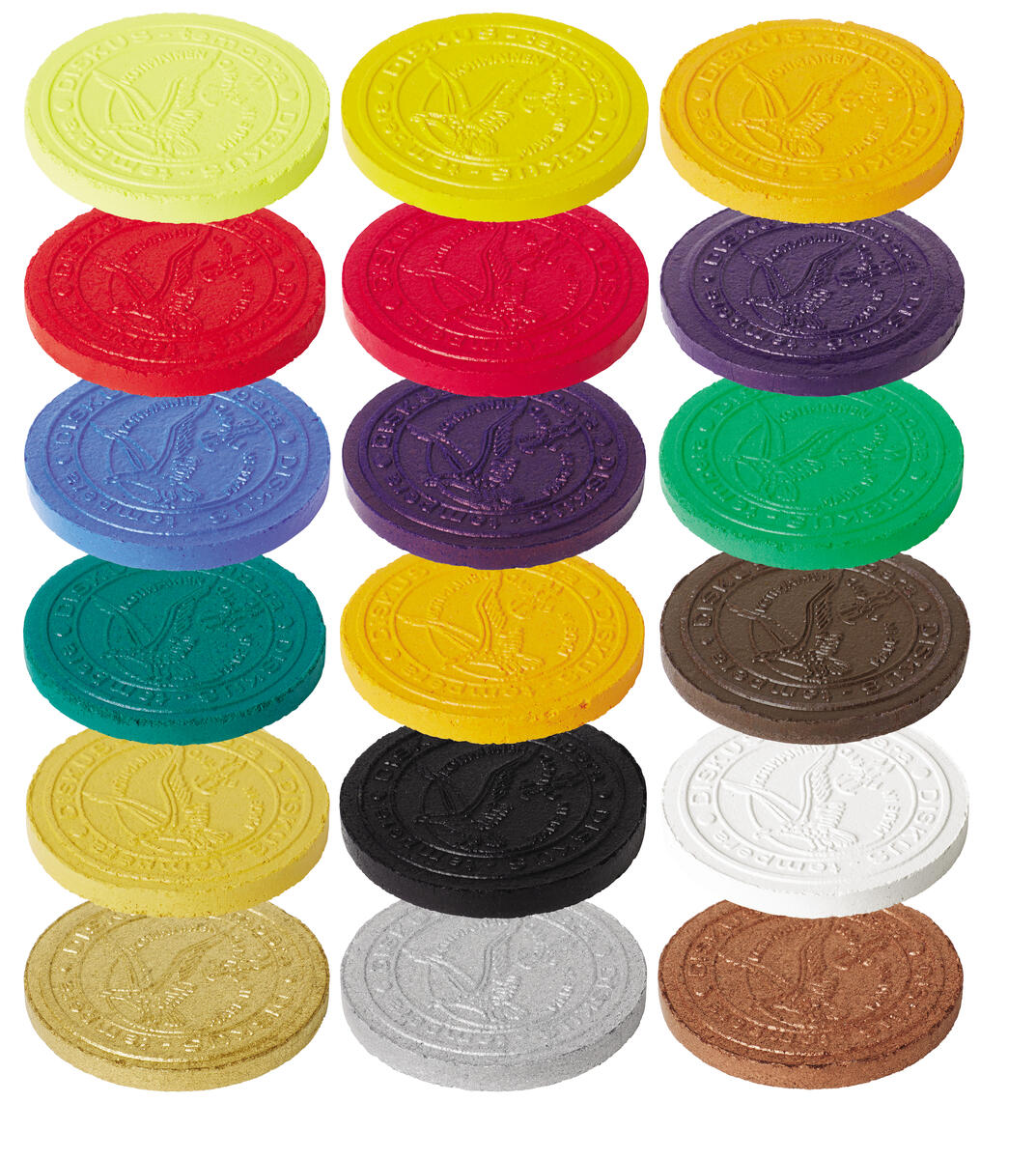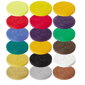 72 st/fp, ø 44 mm. Tjocklek 14 mm. Vattenlöslig och blandbar täckfärg med god täckförmåga. Kan användas både vid täckande och laserande målning. Ett klassrumsset som innehåller 6 st av citrongult, klargult, rött, mörkrött, cerise, klarblått, mörkblått, klargrönt, mörkgrönt, brunt, svart och vitt. PVC-fri.