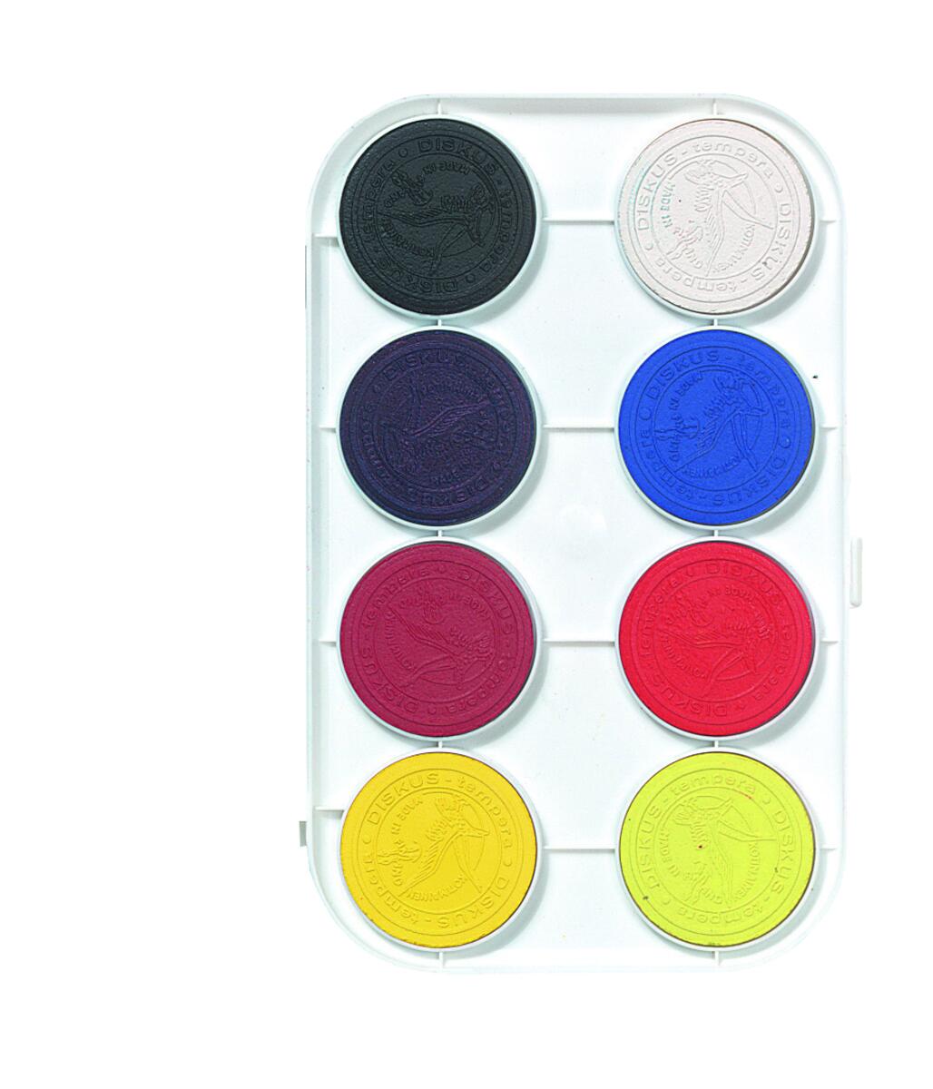 144 st/fp. ø 55-57 mm. Tjocklek 16 mm. Vattenlöslig och blandbar täckfärg med god täckförmåga. Kan användas både vid täckande och laserande målning. Ett klassrumsset som innehåller 12 st av citrongult, klargult, rött, mörkrött, klarblått, mörkblått, klargrönt, mörkgrönt, brunt, svart och vitt samt 6 st av cerise och violett. PVC-fri.