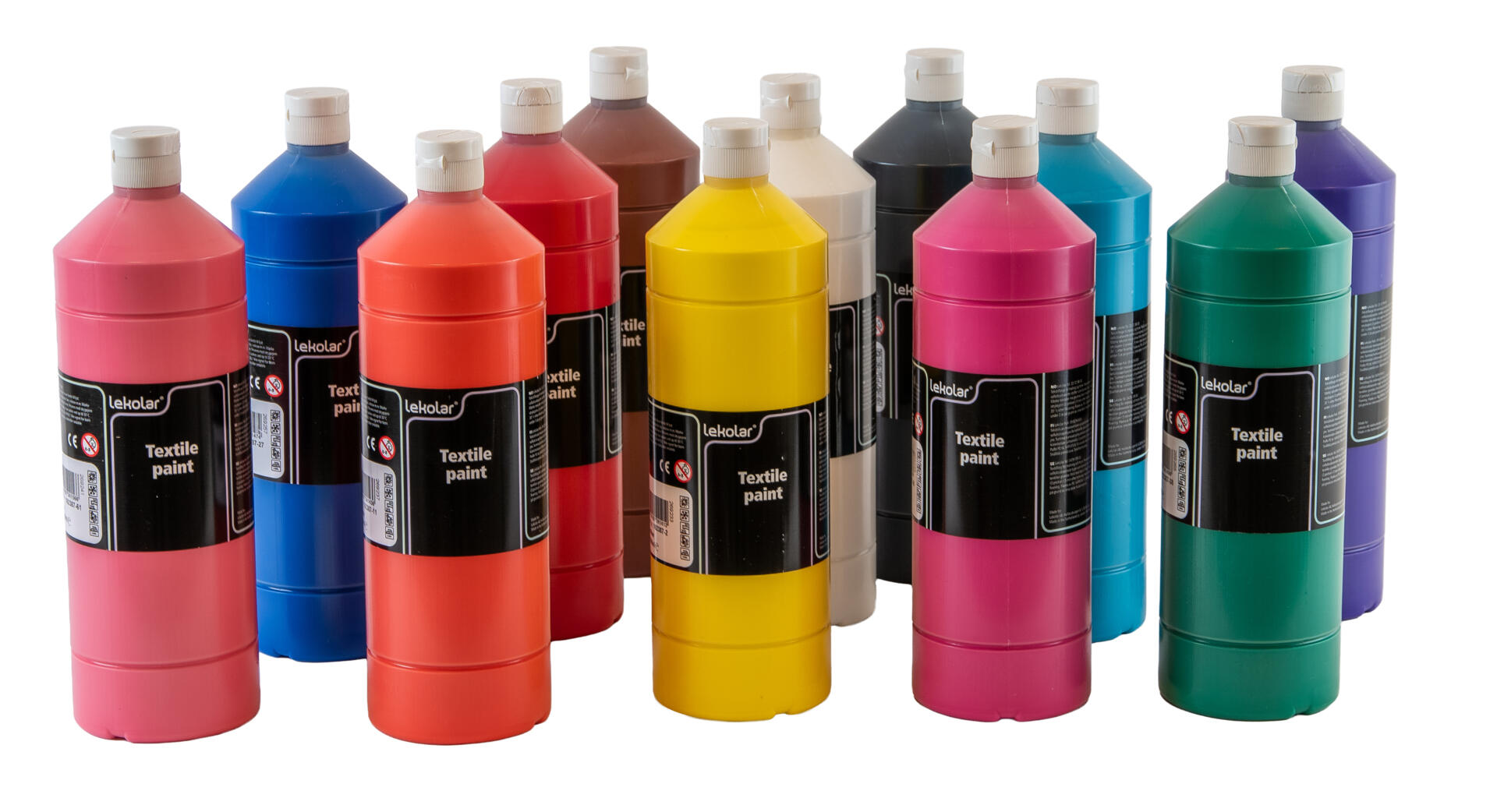 8x500 ml. Textilfärg för målning och tryck. Passar bäst till ljusa, cellulosabaserade tyger som bomull, lin viscos m.m. Mörka textiler grundas med täckvit textilfärg 119390. Fixeras med strykjärn på 50-60ºC i fem minuter efter torkning. Kan tvättas i upp till 40 °C. Färgen kan ge upphov till fläckar även utan fixering, skydda därför alltid kläder och ömtåliga ytor vid användande. Innehåller täckvit, gul, röd, rosa, lila, ljusgrön, grön och svart. PVC-fri.