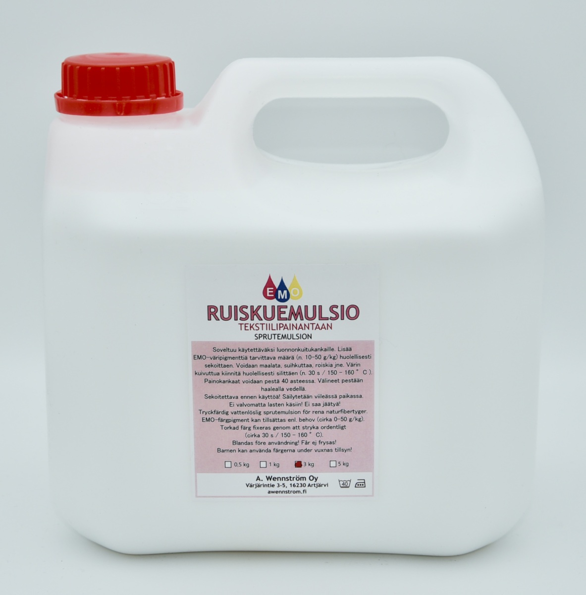 3 kg. EMO sprayemulsion som förtunning för EMO tryckemulsion, färdiga tryckfärger och mattvitt. Kan även användas för målning, sprinkling och solteknik. Tryckfärdig vattenlöslig sprayemulsion för rena naturfibrer. Färgpigment kan tillsättas vid behov. Fixering med värmebehandling. Pressning med värmepress eller strykjärn: 150 °C i 30 s - 1 min. I ugn: 150 °C i 5-7 min. Tvätt i 40 °C. Alla tryckta textilier ska tvättas ut och in. Tvättmedel utan blekmedel.
