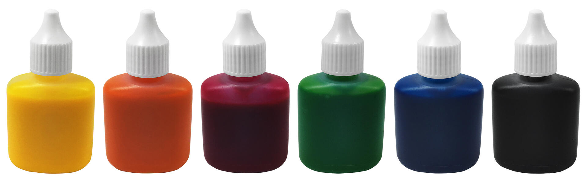 6x25 ml/fp. Oljebaserad marmoreringsfärg i droppflaska av plast. Återförslutningsbar skruvkork. Marmorering kräver ingen förberedelse. Färgerna droppas ovanpå en vattenyta och formas till mönster med sticka eller annat redskap innan marmorering. Fungerar på papper, kartong och liknande ytor. För bästa resultat börja med mörkare färger i badet. Enkel handledning medföljer. PVC-fri. Från 3 år.