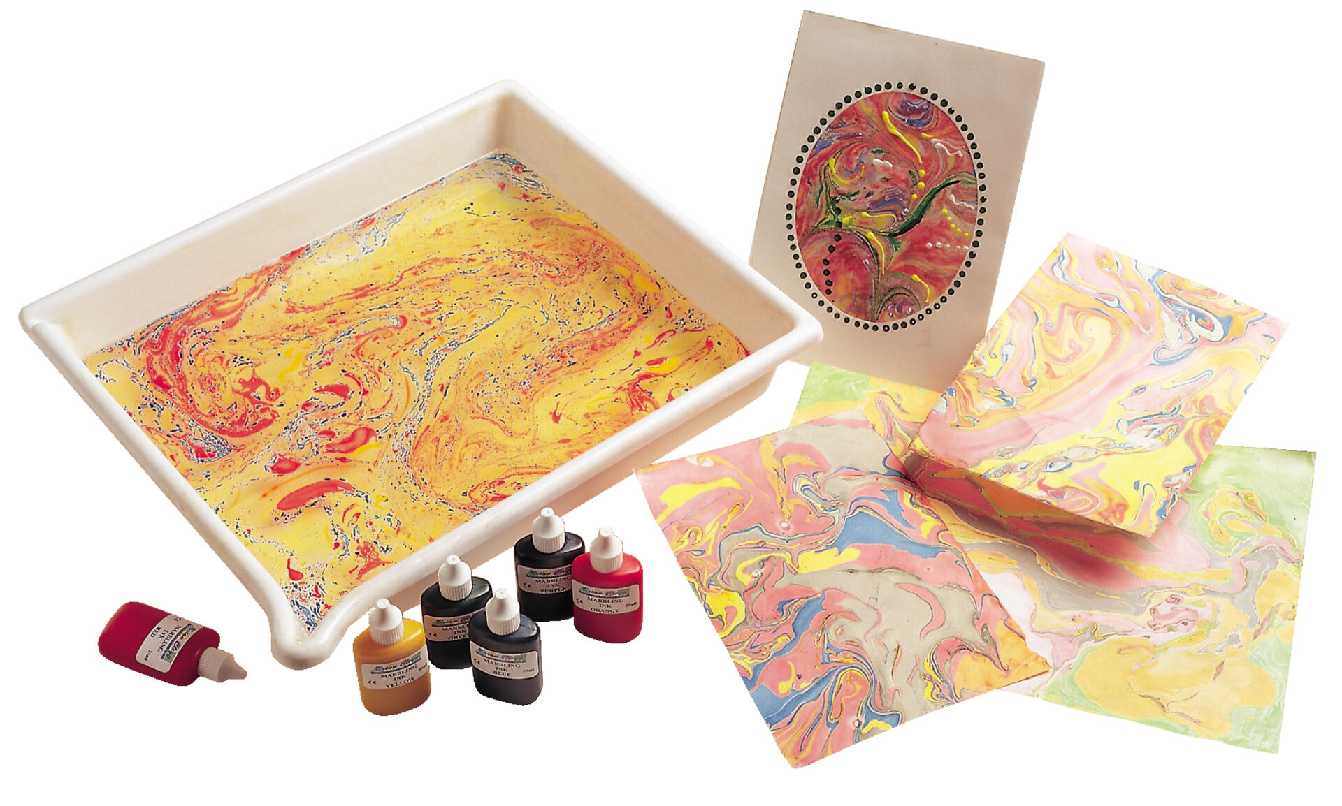 6x25 ml/fp. Metalliska marmoreringsfärger i droppflaskor av plast med skruvkork. Färgerna droppas på en vattenyta och formas till mönster med sticka eller annat redskap innan marmorering. Fungerar på papper, kartong och liknande ytor. För bästa resultat börja med mörkare färger i badet. Enkel handledning medföljer. PVC-fri. Från 3 år.