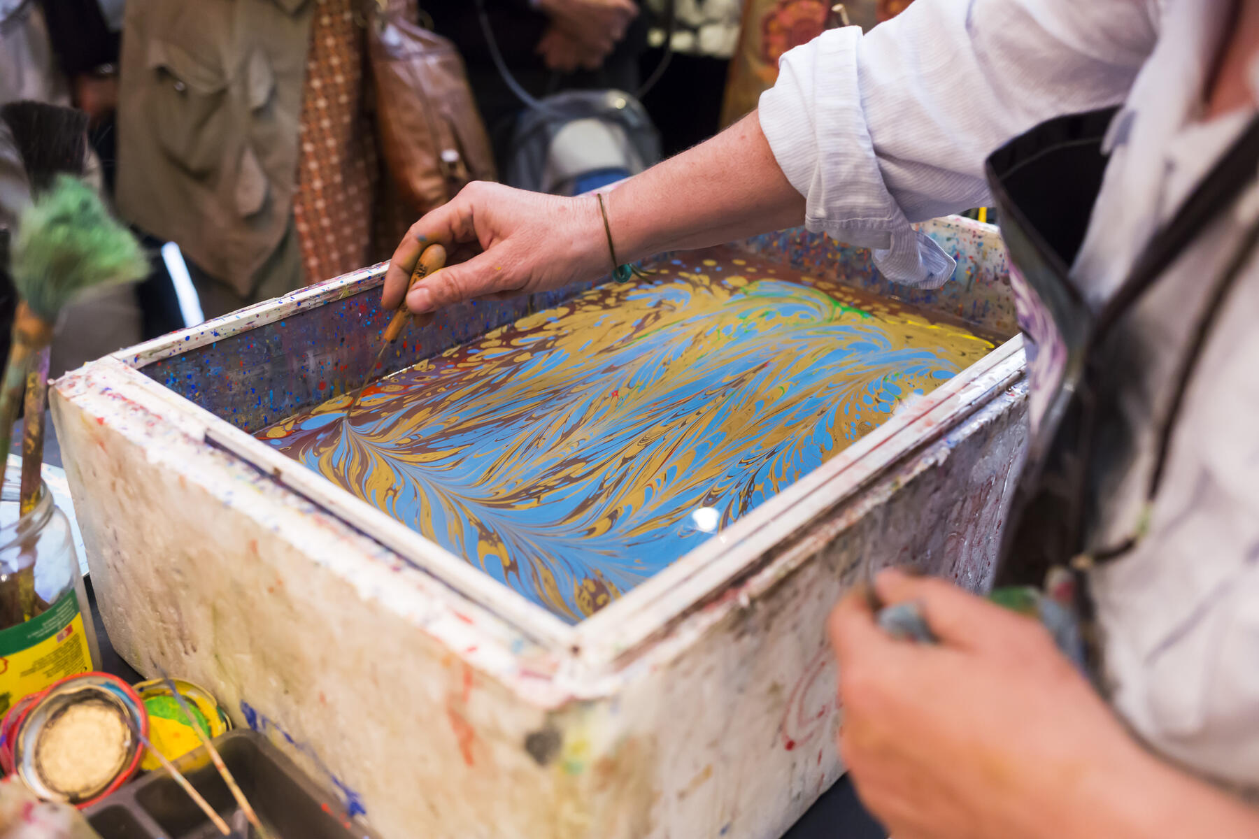 6x25 ml/fp. Oljebaserad marmoreringsfärg i droppflaska av plast. Återförslutningsbar skruvkork. Marmorering kräver ingen förberedelse. Färgerna droppas ovanpå en vattenyta och formas till mönster med sticka eller annat redskap innan marmorering. Fungerar på papper, kartong och liknande ytor. För bästa resultat börja med mörkare färger i badet. Enkel handledning medföljer. PVC-fri. Från 3 år.