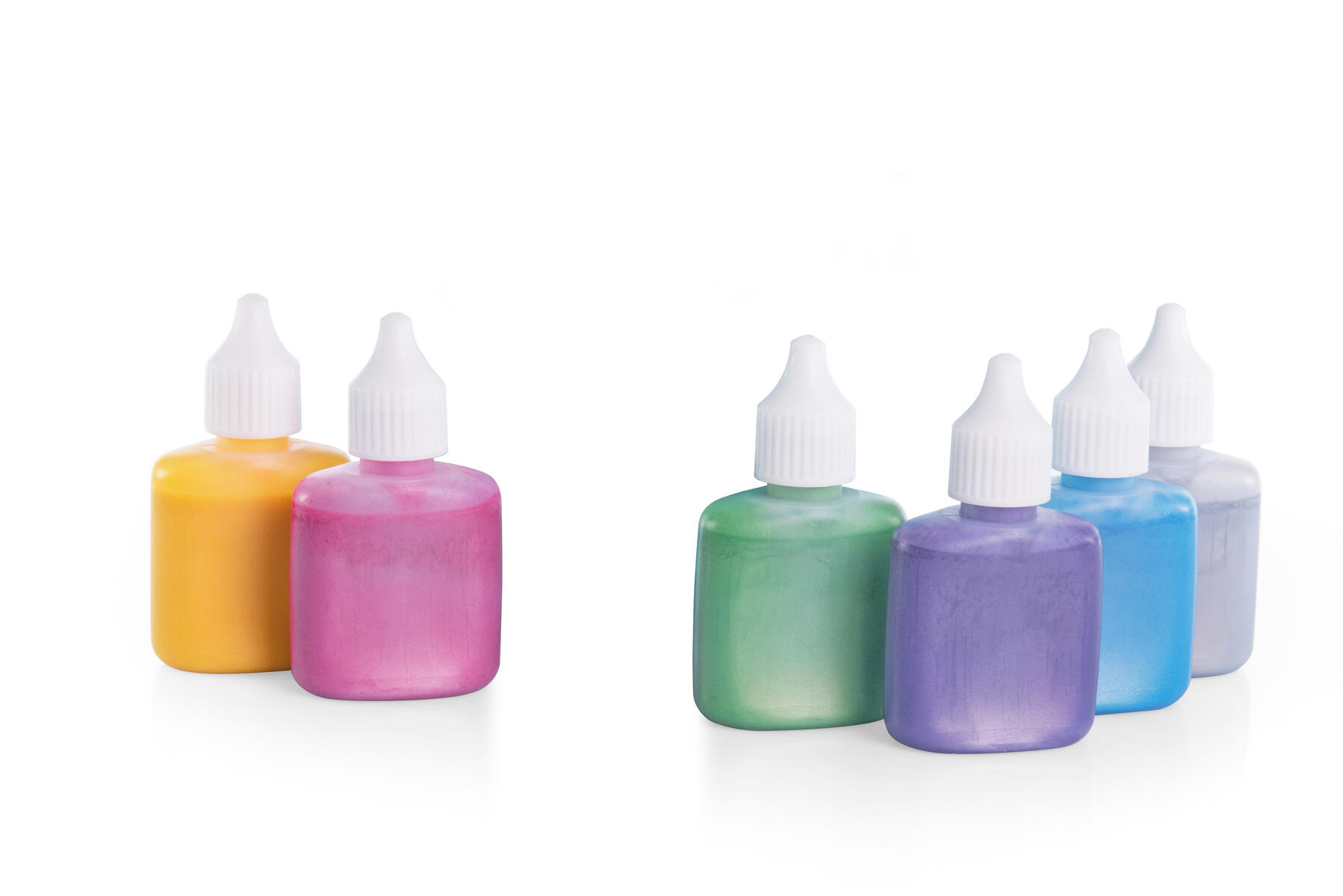 6x25 ml/fp. Metalliska marmoreringsfärger i droppflaskor av plast med skruvkork. Färgerna droppas på en vattenyta och formas till mönster med sticka eller annat redskap innan marmorering. Fungerar på papper, kartong och liknande ytor. För bästa resultat börja med mörkare färger i badet. Enkel handledning medföljer. PVC-fri. Från 3 år.