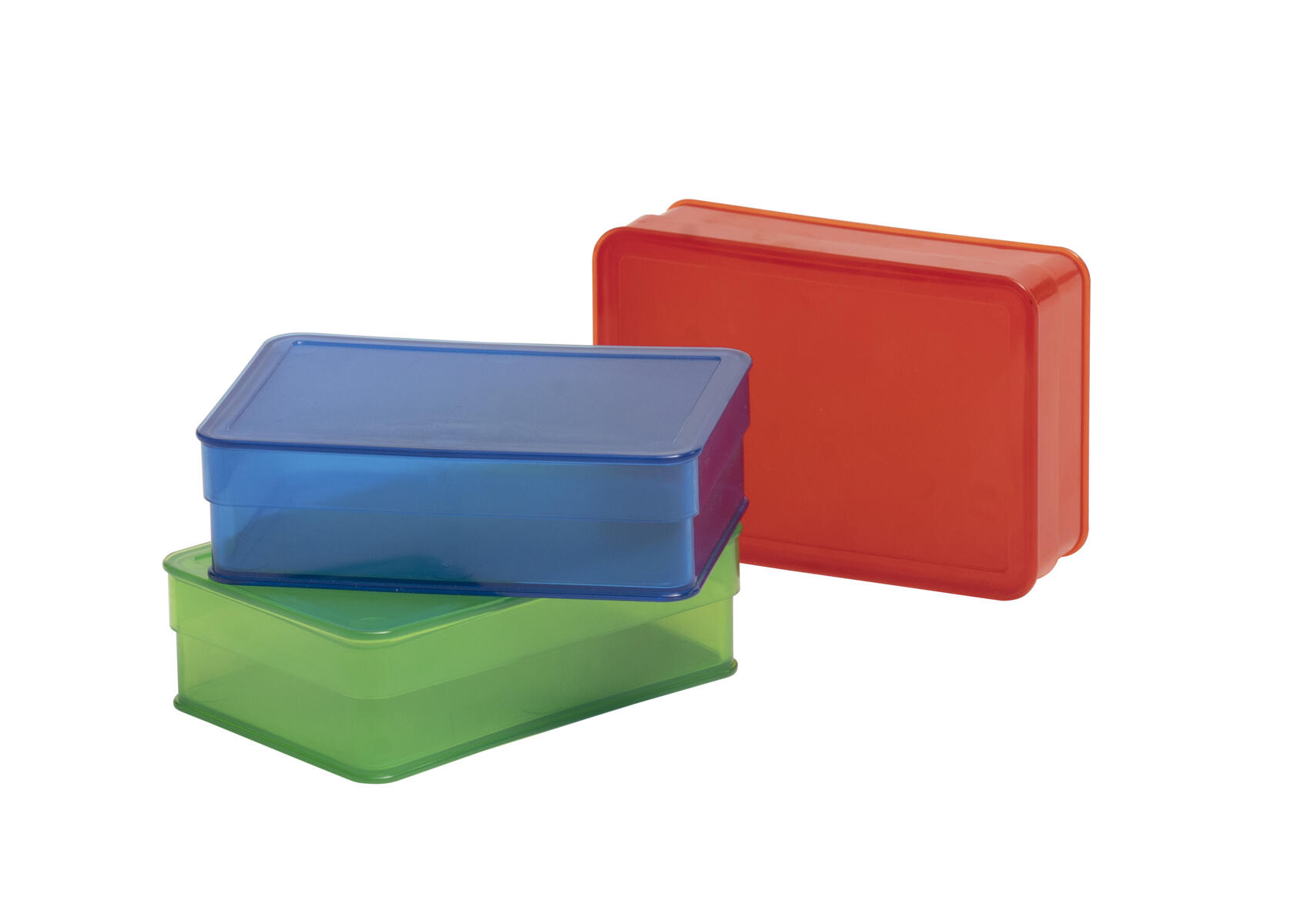 Större plastlåda i 3 nivåer. Har lock med handtag och mindre handtag i sidorna. För sortering och förvaring av t.ex. rörpärlor. Varje nivå innehåller 8 fack, totalt 24 fack. En hel förvaringslåda rymmer ca 12 000 midirörpärlor. Mått: B19xL24xH15,5 cm. Av PP. PVC-fri.