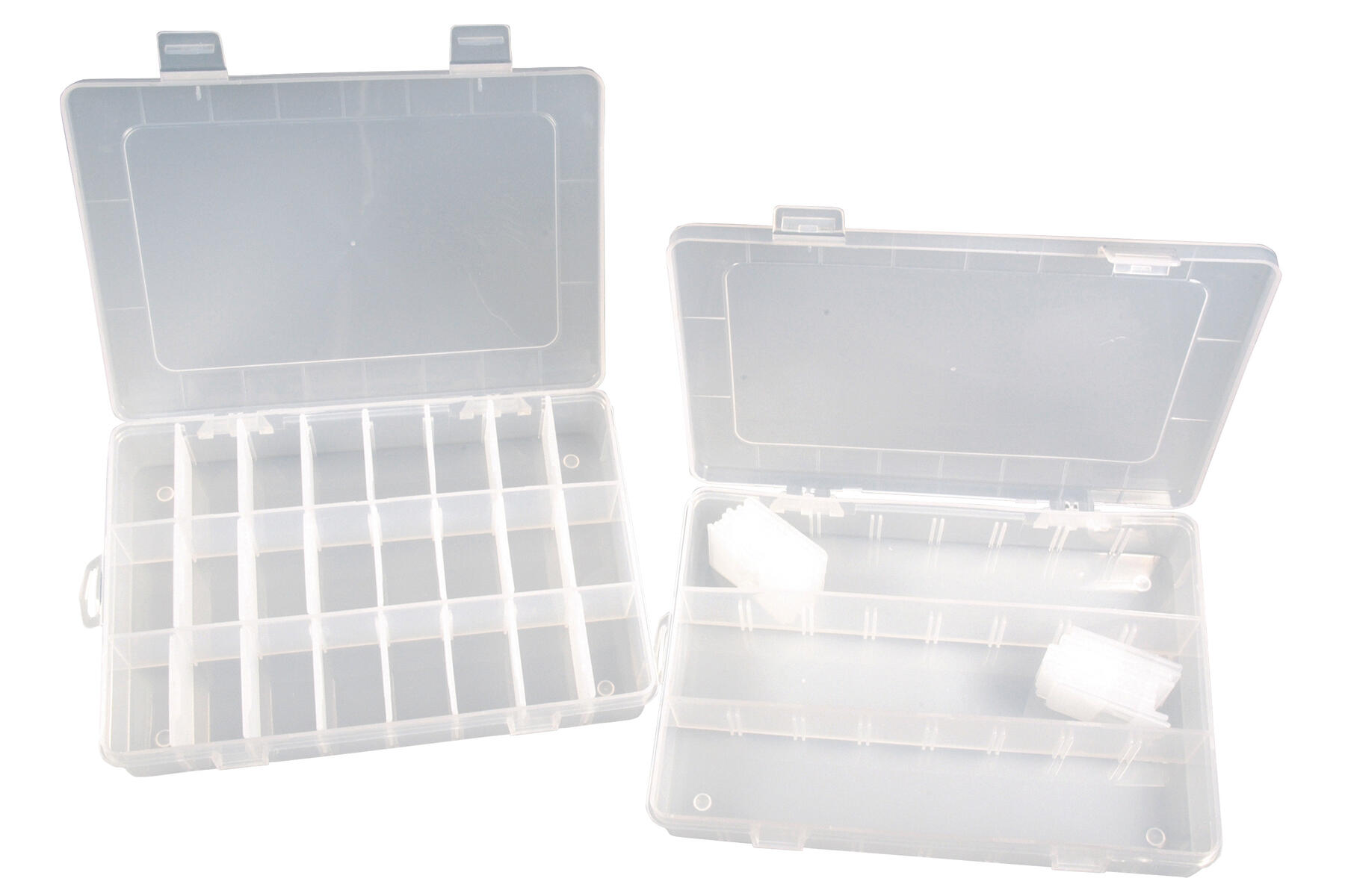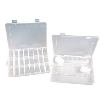 Liten förvaringsask i tålig, transparent plast. Asken kan delas i 24 fack med hjälp av flyttbara väggar. Gångjärn och snäpplås. Asken lämpar sig utmärkt för förvaring av pärlor, smyckedetaljer och andra små delar. Mått: B20xD13,5xH3,7 cm. Torkas med våt trasa eller diskas för hand. Tillverkad av polypropen.