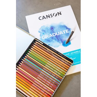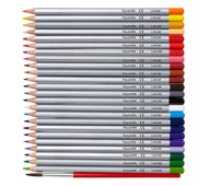 24 st/fp. Hexagonala vattenlösliga färgpennor av hög kvalitet. Passar både för torr färgläggning och akvarell. 24 olika färger. Hellimmat färgstift 3,3 mm i diameter, med extra mycket färgpigment. Längd 180 mm. Tillverkade av PEFC-certifierat cederträ. Levereras i metalletui tillsammans med en pensel av syntetborst.