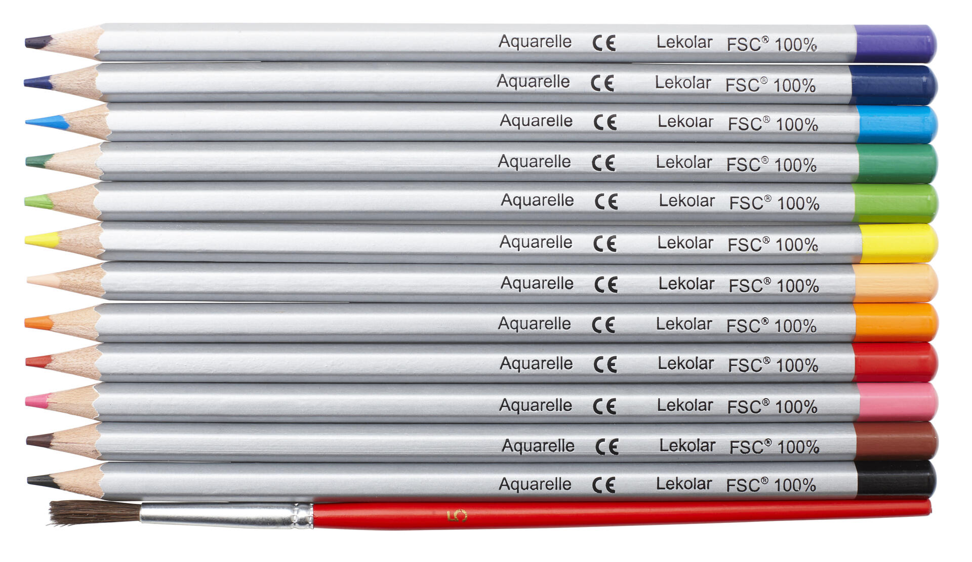 12 st/fp. Färgpennor som passar för både torr färgläggning och akvarellmålning. Extra mjukt, hållbart färgstift av kvalitetspigment. Färgerna är blandbara med varandra, vilket ger en akvarelleffekt när man målar över med vatten. Hexagonal pennkropp med lackerad topp. Finns i färgerna lila, aprikos, orange, mörkgrön, grön, mörkblå, blå, röd, rosa, svart, gul, brun och en pensel. FSC-märkt. PVC-fri.