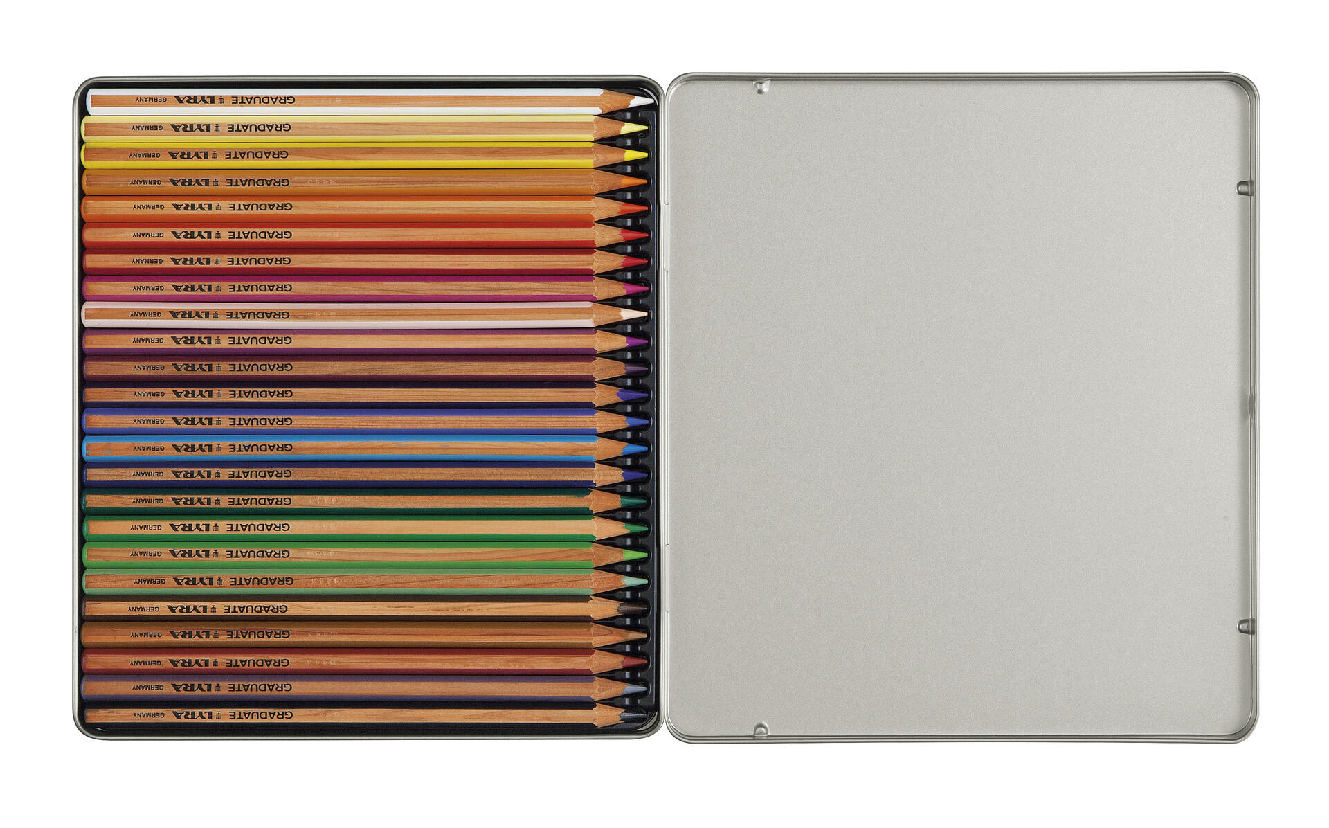 36 st/fp. Hexagonala vattenlösliga färgpennor av hög kvalitet. Passar både för torr färgläggning och akvarell. 36 olika färger. Hellimmat färgstift 3,3 mm i diameter, med extra mycket färgpigment. Längd 180 mm. Tillverkade av PEFC-certifierat cederträ. Levereras i metalletui tillsammans med en pensel av syntetborst.