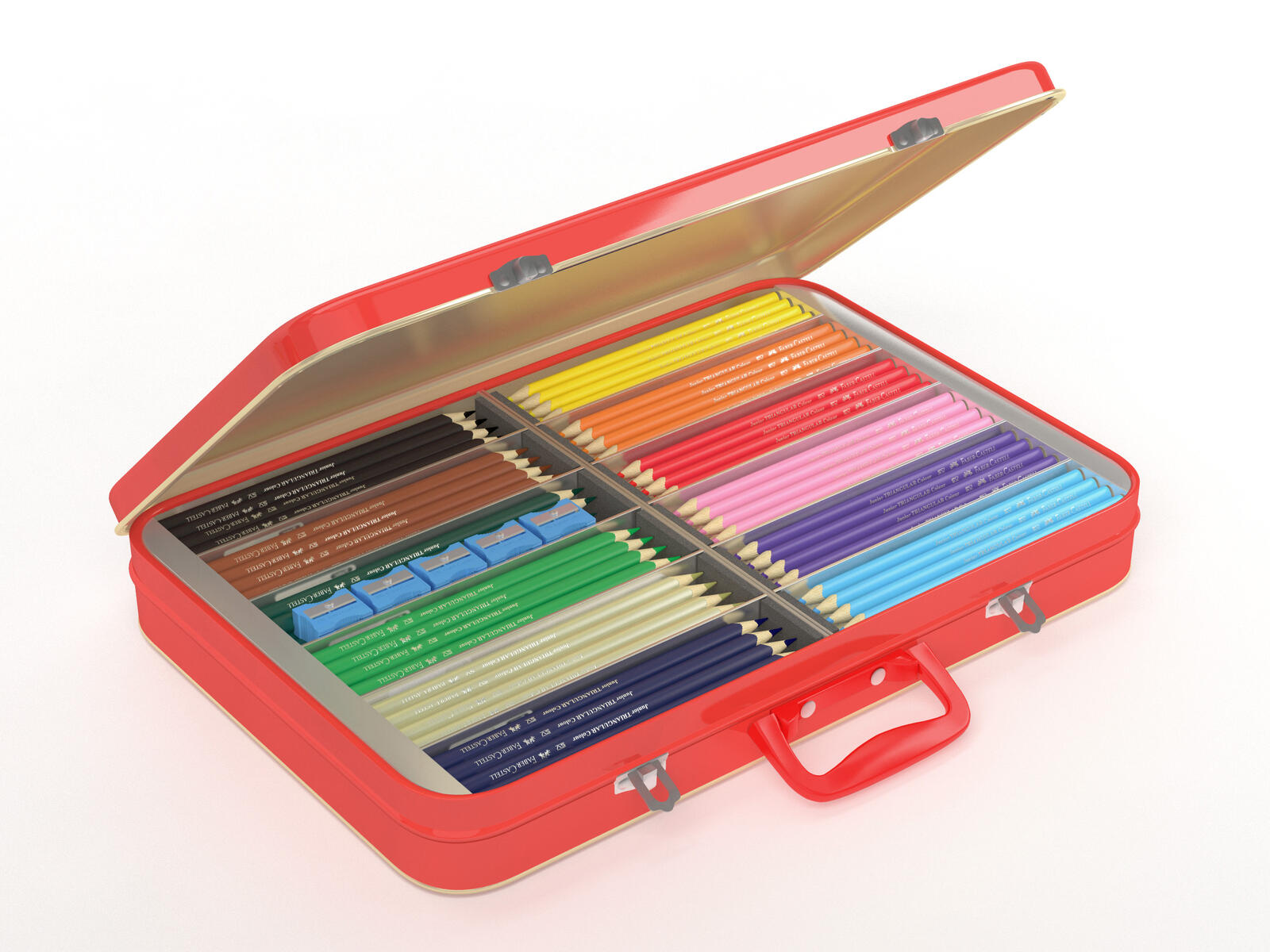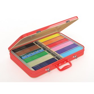 300 delar/fp. Hexagonala färgpennor. Klassrumsuppsättning med 295 st pennor i 15 färger. Levereras i metallväska med handtag. Ingår 5 st Pennvässare. Innehåller: 25 st silver, 25 st svart, 25 st guld, 25 st brun, 25 st blå, 25 st ljusblå, 25 st röd, 25 st orange, 25 st laxrosa, 15 st grön, 10 st mörkgrön, 15 st lila, 10 st rosa, 15 st gul och 10 st vit. Längd: 174 mm. ø 7 mm. Pennor av trä. PVC-fri.