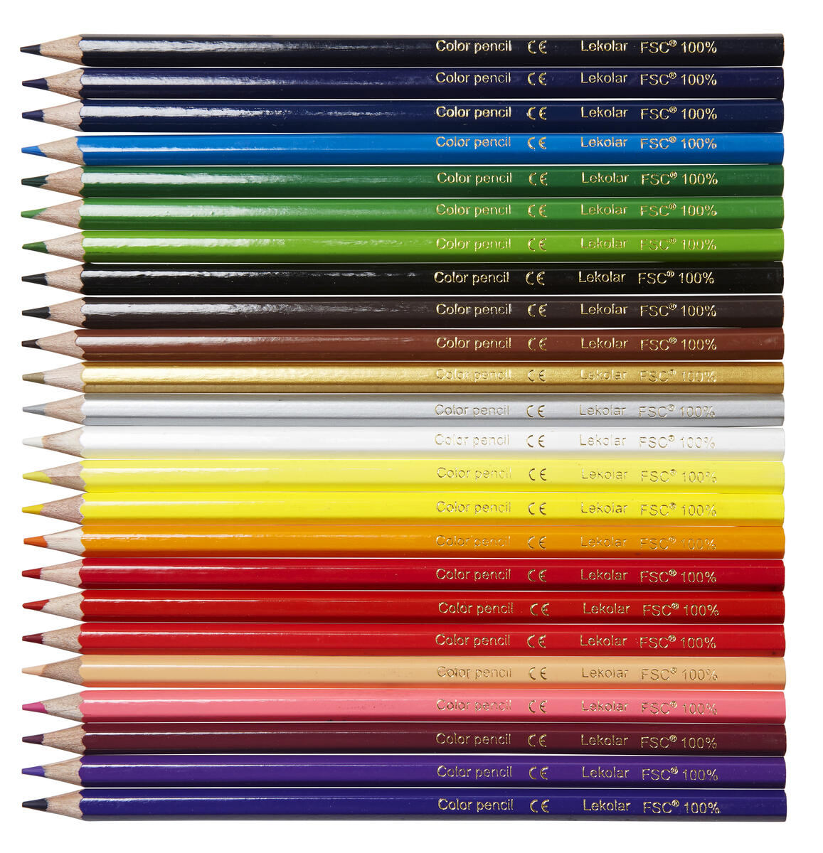 24 st/fp. Färgpennor av hög kvalitet och med god täckförmåga. Hellimmat färgstift. Ingår: gul, ljusgul, orange, aprikos, rosa, ljusröd, röd, mörkröd, ljusgrön, grön, mörkgrön, ljusblå, blå, mörkblå, marinblå, lila, mörklila, vinröd, brun, mörkbrun, svart, vit, guld och silver. FSC-märkta. PVC-fri.