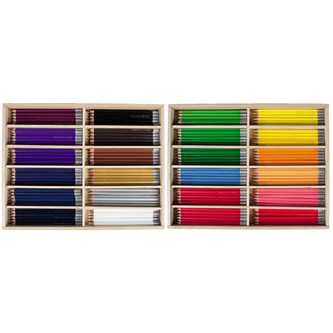 288 st/fp. Trekantiga färgpennor av hög kvalitet och god täckförmåga. Hellimmat färgstift. Ingår 24 pennor av: ljusgrön, grön, ljusblå, blå, gul, rosa, röd, mörkröd, brun och svart. 12 st pennor av orange, lila, guld och silver. Vässas i pennvässare som klarar upp till ø 12 mm. Två trälådor med lock medföljer. PVC-fri.