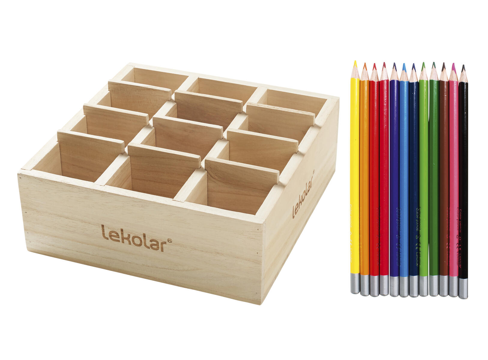 Passar stående förvaring av 96–144 pennor beroende på diameter. Fungerar även som mobillåda i skolan. Avdelarna mellan facken kan tas bort. Mått: B220xD230xH80 mm. Mått på facken: L50xB60xH80 mm. Pennor ingår ej. FSC-certifierat trä.