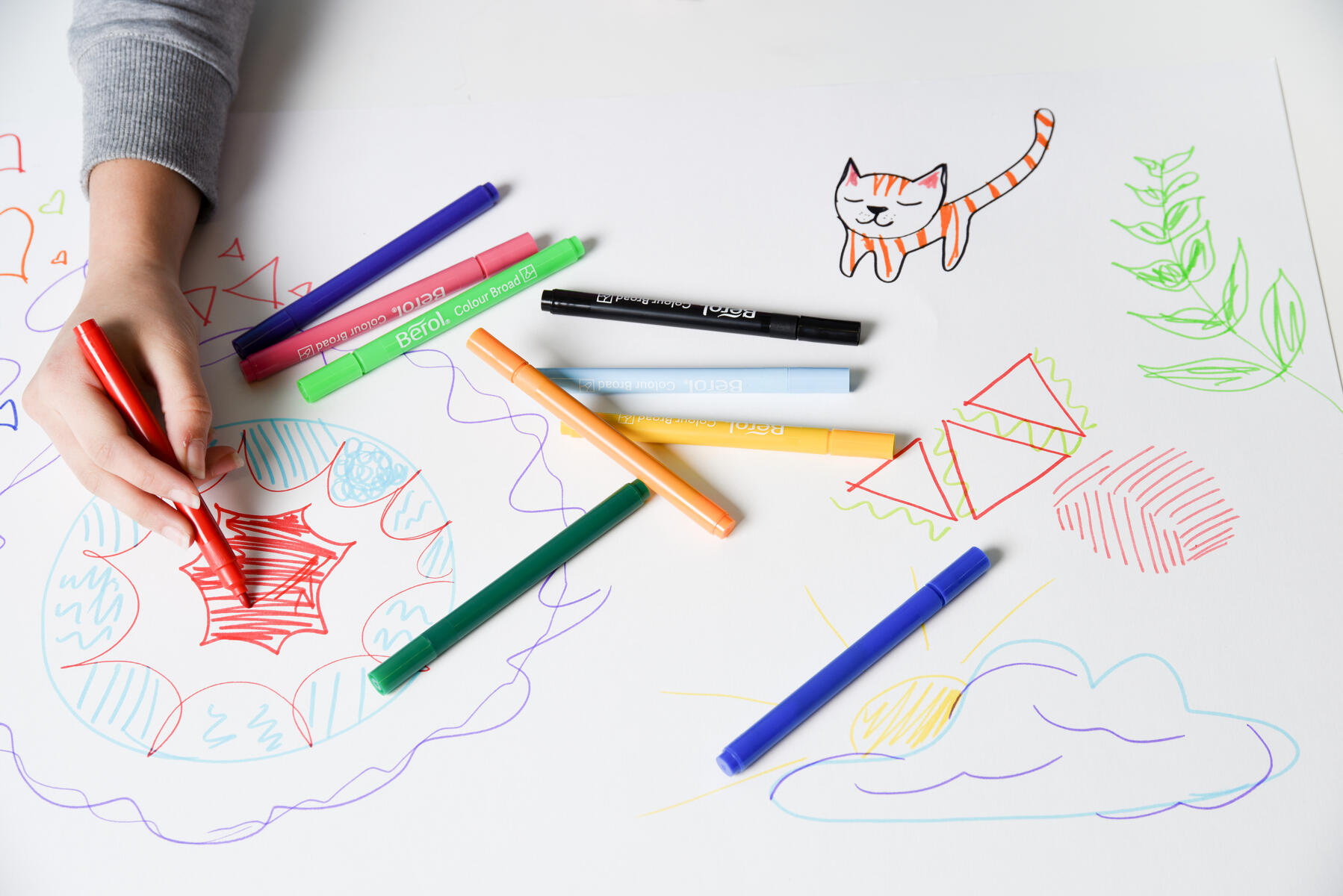 42 st/fp. Fiberpennor från Berol av hög kvalitet. Innehåller 6 st svarta. 4 av varje röd, lila, mörkblå, grön, brun. 3 av varje gul, orange, blå, ljusgrön. 2 av varje rosa, grå. Tålig, rundad spets. Flödigt bläck som passar färgläggning av lite större ytor och inte blöder igenom ritpapper. Ventilerad huv och pennkropp av plast, i samma nyanser som bläcket. Pennan kan ligga utan huv i upp till två veckor utan att torka ut. Bläcket kan tvättas bort från kläder, men skydda alltid underlag och textilier vid användande. CE-märkta. PVC-fri. Från 3 år.