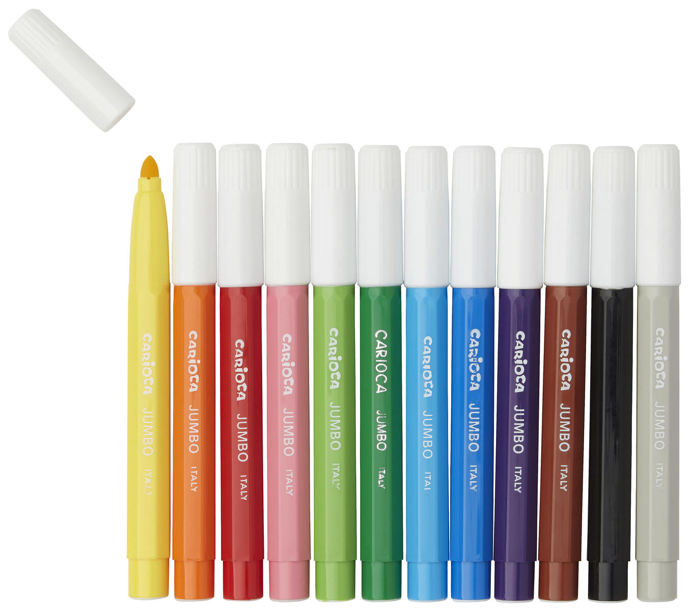 12 st/ask. Tjocka fiberpennor av hög kvalitet i intensiva färger med en extra tålig och åtsittande spets. Ventilerad huv med säkerhetsplugg som gör den kvävningssäker. Linjebredd från 1,3 mm. Spettsbredd 5 mm. Giftfritt vattenbaserat bläck som går lät att tvätta av från de flesta textilier i maskintvätt 40 °C. Tvättas av från huden med tvål och vatten. PVC-fri. Från 3 år.