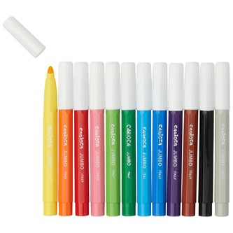 108 st/fp. 12 färger. Extra tjocka fiberpennor av hög kvalitet i intensiva färger med en extra tålig och åtsittande spets. Spetsen går inte att trycka in i pennan. Ventilerad huv med säkerhetsplugg som gör den kvävningssäker. Linjebredd från 1,3 mm. Spetsbredd 5 mm. Vattenbaserat bläck som går lätt att tvätta av från de flesta textilier i maskintvätt 40 °C. Tvättas av från huden med tvål och vatten. Tjocklek penna: 13 mm. Tjocklek spets: 5 mm. Förpackning gjord utav återvunnen plast. PVC-fri. Från 3 år.
