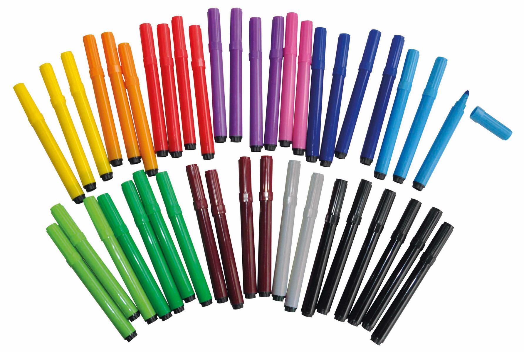 42 st/fp. Fiberpennor från Berol av hög kvalitet. Innehåller 6 st svarta. 4 av varje röd, lila, mörkblå, grön, brun. 3 av varje gul, orange, blå, ljusgrön. 2 av varje rosa, grå. Tålig, bred och rundad spets. Flödigt bläck som passar färgläggning av lite större ytor och inte blöder igenom ritpapper. Ventilerad huv och pennkropp av plast, i samma nyanser som bläcket. Pennan kan ligga utan huv i upp till två veckor utan att torka ut. Bläcket kan tvättas bort från kläder, men skydda alltid underlag och textilier vid användande. CE-märkta. PVC-fri. Från 3 år.